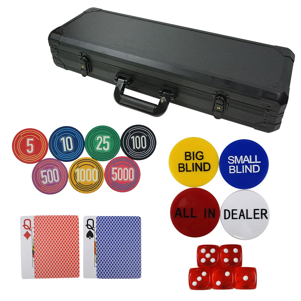 This Casino Poker Room Ceramic Poker Chip Sets is our professional poker game accessory set for casinos and poker rooms and other entertainment venues exiting in Europe and the United States. It contains 500 pieces of ceramic poker chips, of course, you can also change the design or material of the chips according to your needs, such as clay chips, ABS chips and other common poker chips. In addition to the chips this black chip aluminum case has a deck of waterproof plastic playing cards, 5 red acrylic dice, 4 pcs dealer button, all poker game accessories are included in this high quality luxury ceramic chip set.